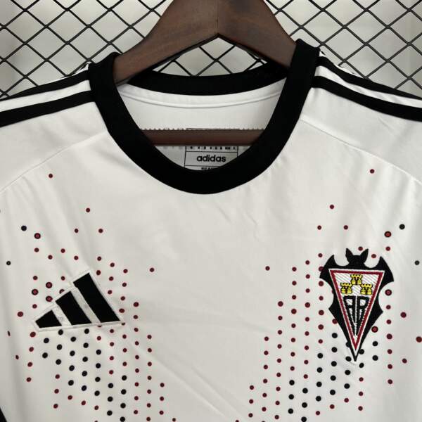 La Camiseta Albacete Local 2025-2026 luce un diseño blanco con detalles negros en cuello y hombros, incorporando un patrón de puntos rojos en el pecho que aporta un toque moderno y dinámico. El escudo del club y el logo del patrocinador destacan en contraste, resaltando la identidad del equipo.