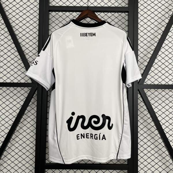 2. Detalles en Negro: Las mangas y los hombros presentan líneas negras que destacan el logo del fabricante y el escudo del equipo, creando un contraste elegante.