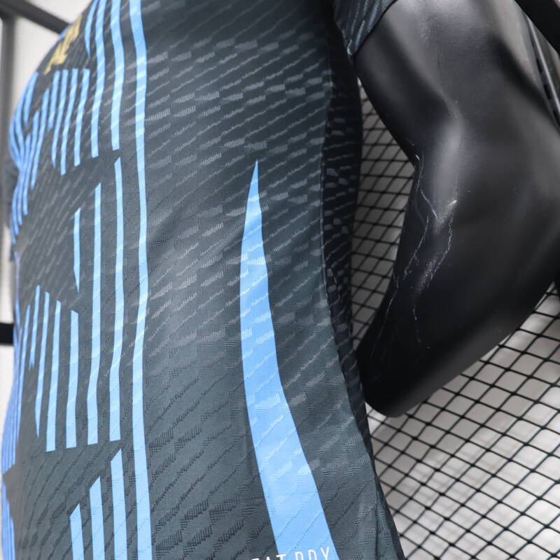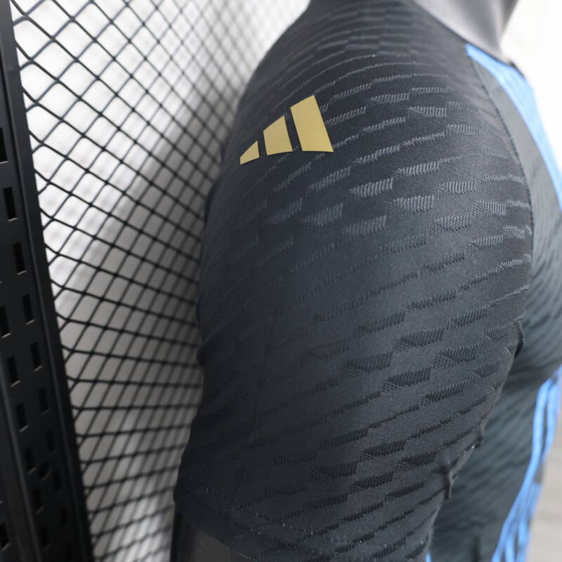 Camiseta Argentina segunda equipación versión jugador Mundial 2026 con diseño moderno en negro y detalles azules de alto rendimiento.