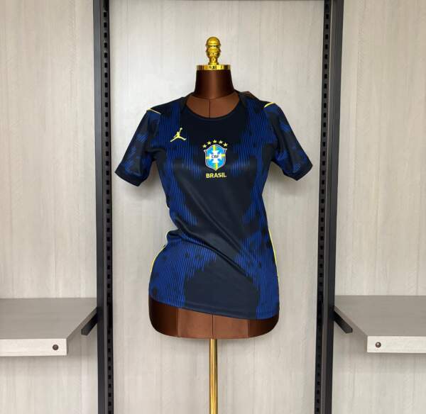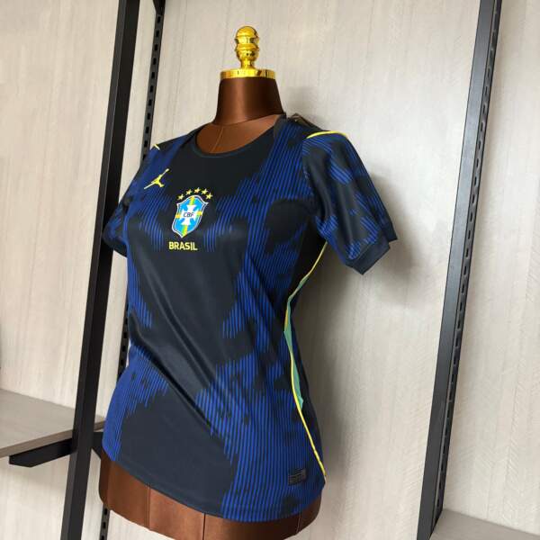 Descubre la camiseta de Brasil visitante para mujer del Mundial 2026, una prenda que combina diseño moderno, ajuste femenino y tecnología deportiva. Su base en tonos oscuros con detalles en azul y acentos en amarillo crea una estética sofisticada que representa la pasión y el talento del fútbol brasileño.