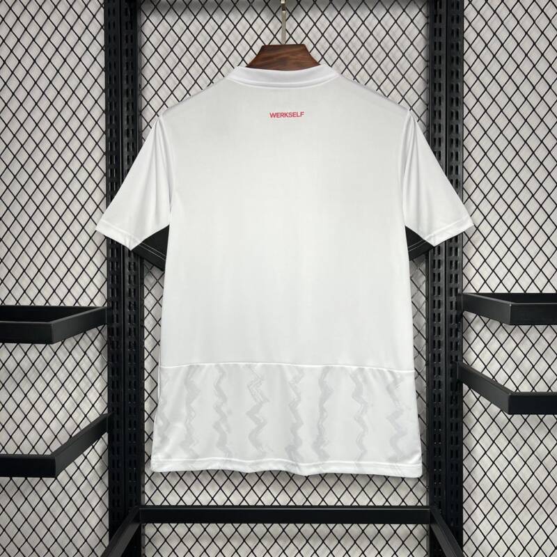 Luce la Camiseta Bayer Leverkusen Visitante 2024-2025 en blanco con rayas en zig-zag de gris claro, un diseño elegante y moderno que refleja la identidad del club. 🔴⚽