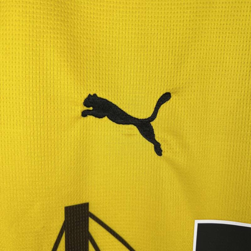 Combina el vibrante amarillo y negro, colores representativos del club. La camiseta lleva el icónico logo de la marca, reconocida marca deportiva, y presenta el gran escudo del Borussia Dortmund en todo su esplendor. Además, cuenta con la inclusión del patrocinador oficial del equipo.