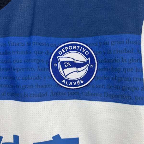 4. Escudo y Patrocinadores: El escudo del Deportivo de Alavés y los logotipos de patrocinadores se integran de manera armónica, sin sobrecargar el diseño general.