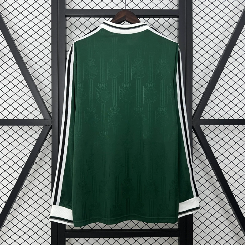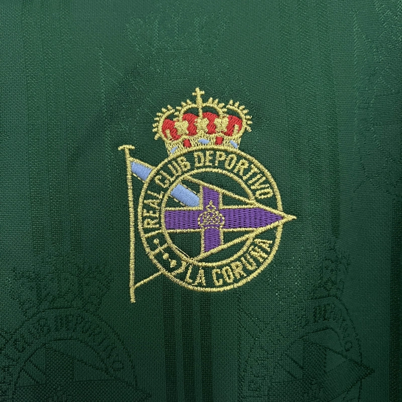 En esta versión alternativa, el verde es el protagonista, en homenaje a los colores de Galicia, acompañado por detalles en blanco en los laterales, cuello y puños. El cuello tipo polo con botón le da un toque clásico, mientras que las mangas largas y el corte holgado evocan el estilo de finales de los 90. El escudo del club está bordado con relieve, junto al logo de Joma y el icónico patrocinador Feiraco al frente.