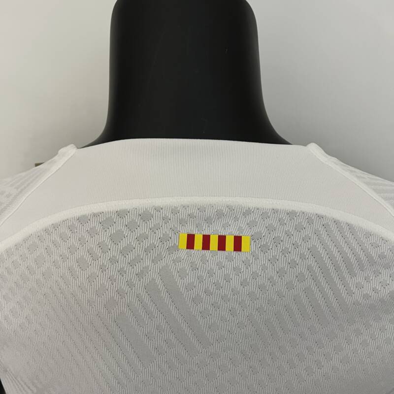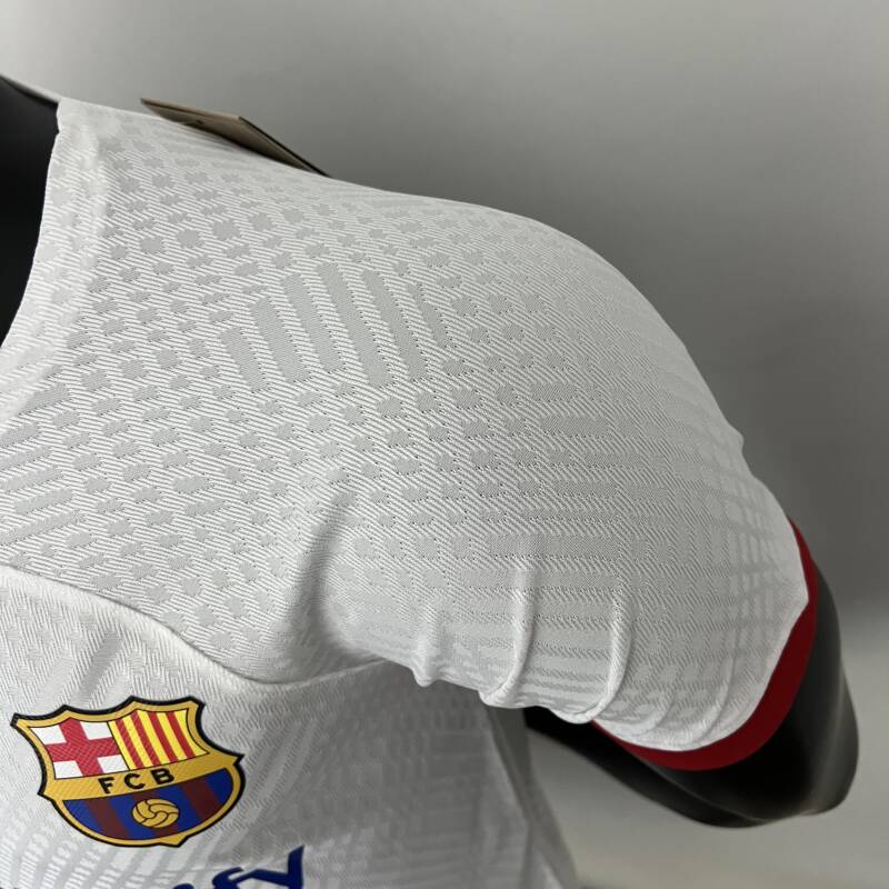 Esta prenda es una verdadera obra de arte. La combinación de los colores del FC Barcelona en una camiseta blanca es impresionante y da una sensación de elegancia y sofisticación. La camiseta cuenta con detalles en azul y granate en las mangas, lo que le da un toque especial. Además, cuenta con el escudo, el logo de la marca en el pecho y su patrocinador que son los detalles perfectos para los seguidores más fieles del equipo.