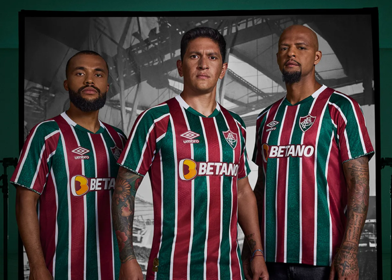 Minimalista y elegante: base granate uniforme, escudo de Fluminense y logo Umbro en contraste claro al pecho, y pequeñas lengüetas