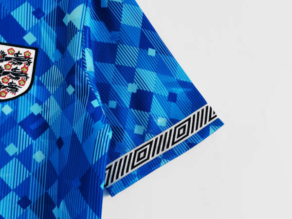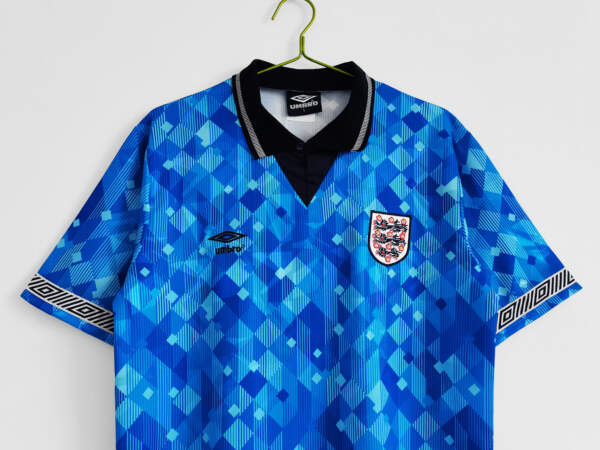 Camiseta Inglaterra tercera visitante retro 1990 con diseño geométrico icónico, perfecta para amantes del fútbol vintage.