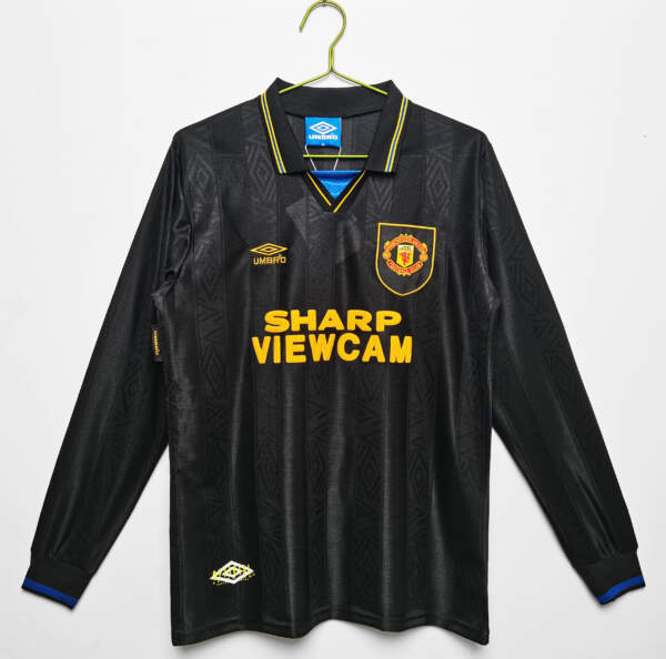 Clásico 93/94 en negro jacquard con cuello polo y vivos amarillos, escudo bordado, Umbro y Sharp Viewcam: esencia retro del United.