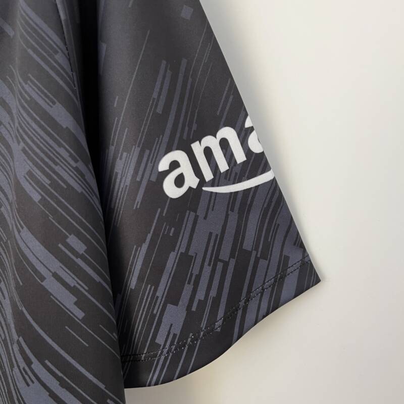 Esta camiseta es una verdadera joya para los aficionados del club. Diseñada para destacar en el campo y fuera de él, esta prenda se distingue por su elegante combinación de colores: Lo que la hace realmente especial a esta camiseta es la manera en que el negro resalta en su diseño. Se extiende por toda la prenda, creando una base sólida y potente que atrae las miradas, esta envuelve a toda la camiseta y los detalles en gris contrastan de manera perfecta con el negro, destacando aún más su intensidad.