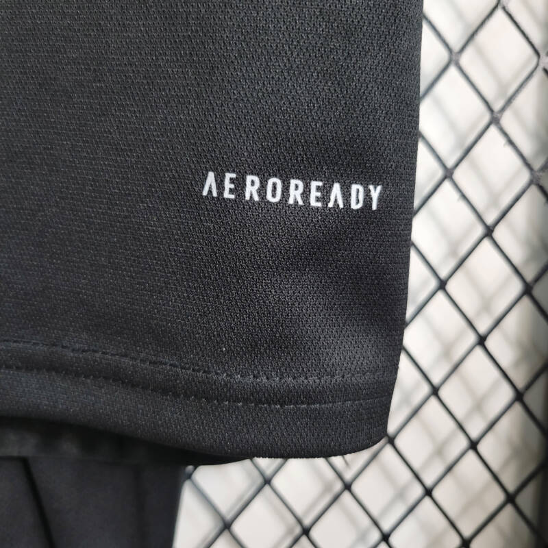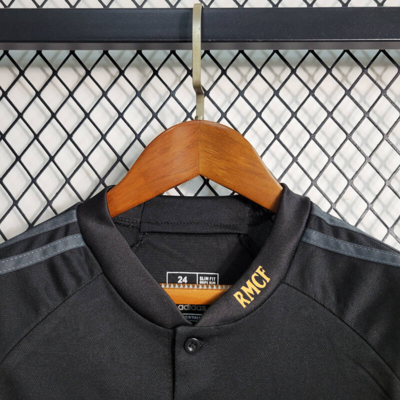 El color negro, que evoca la pasión y el misterio del juego, se convierte en el protagonista absoluto. Las tres icónicas franjas en un tono gris carbono aportan sofisticación, mientras que el vibrante naranja que adorna el patrocinador RMFC añade un toque de energía y vitalidad.